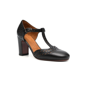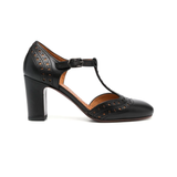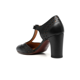 Negro, piel de becerro, detalle de perforaciones, puntera redonda, tira en el tobillo con hebilla y tacón cuadrado alto.